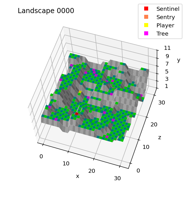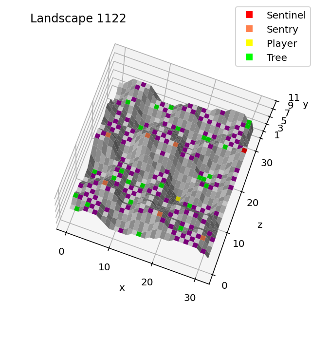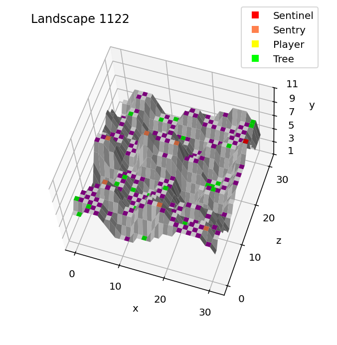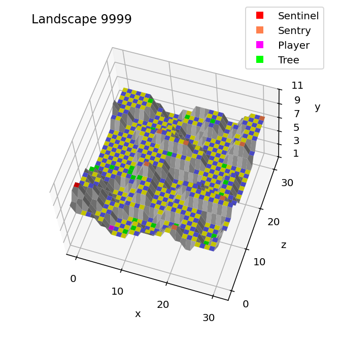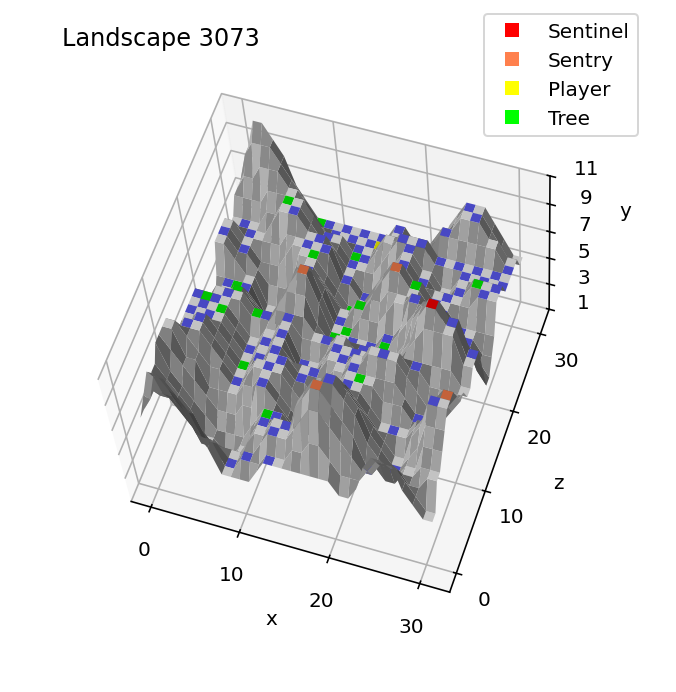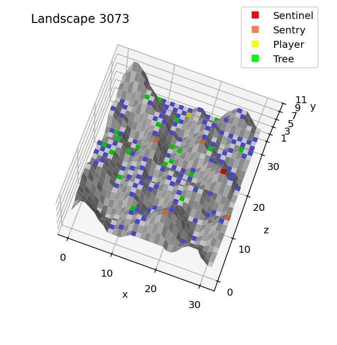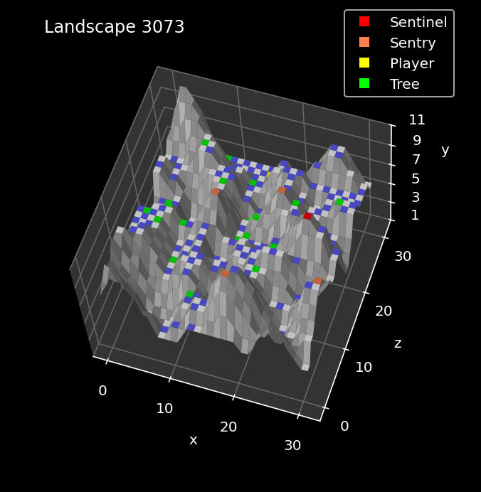 Landscape 3073 is even steeper, with four sentries and the player starting on a tile on the rear plateau: