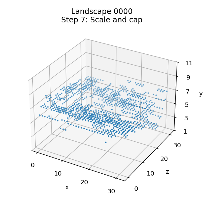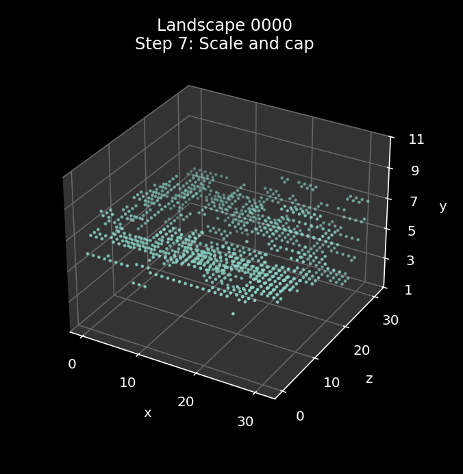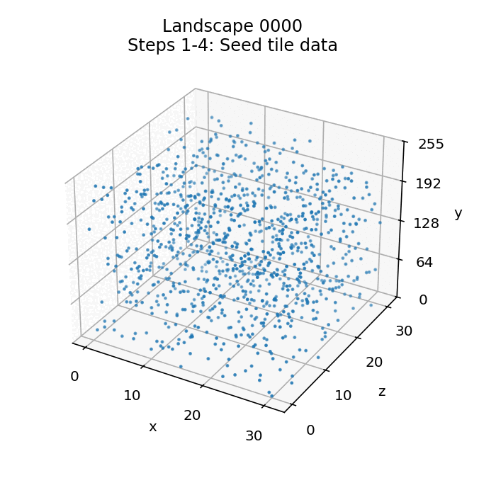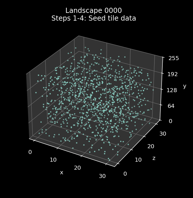 Here's a visualisation of the landscape generation process for landscape 0000 (you can click on the image to see a bigger version, as with all the images in this article):