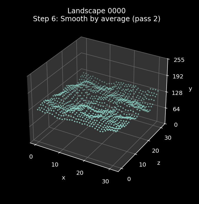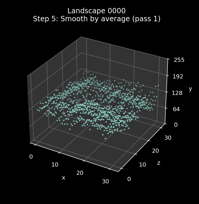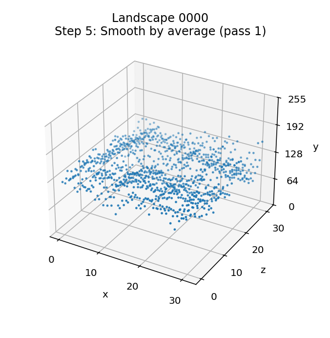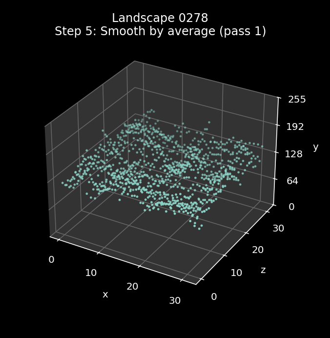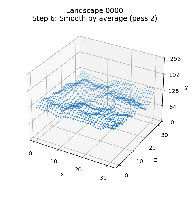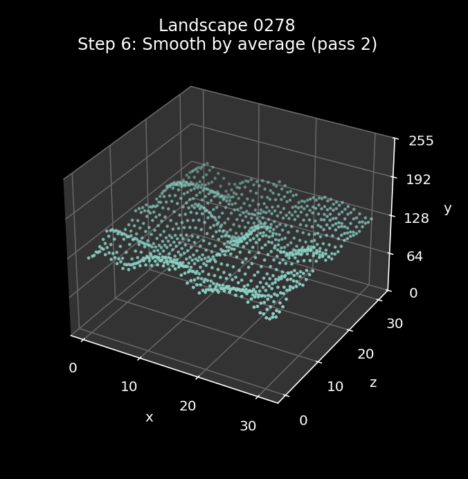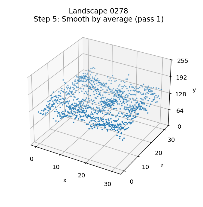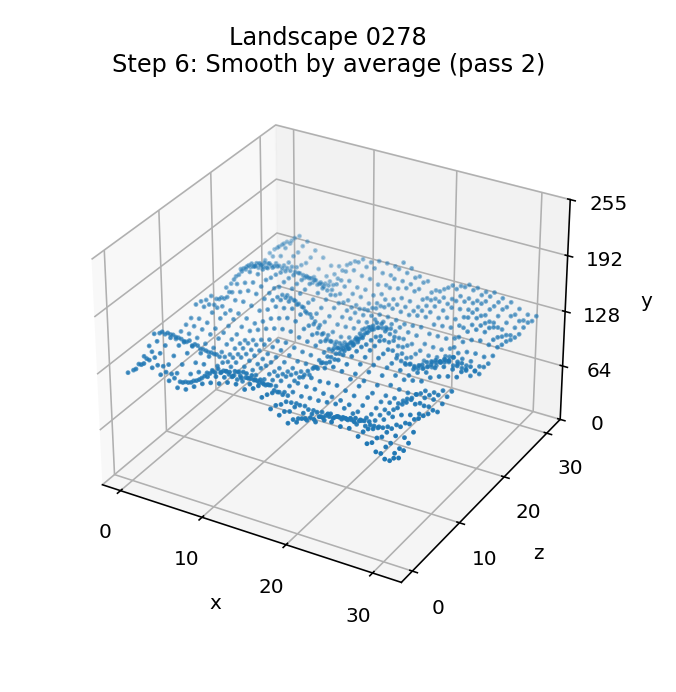 The effect of this repeated smoothing process is quite hard to see, as by this point the landscape is in pretty good shape. The best way to see the differences is via the animations at the start of this article, where you can just about make out a handful of changes between the steps in landscapes 0000 and 3073 (it's pretty subtle, though). The gentle landscape in 0278 doesn't change at all in this step, as the first pass is enough to remove all spikes and troughs.