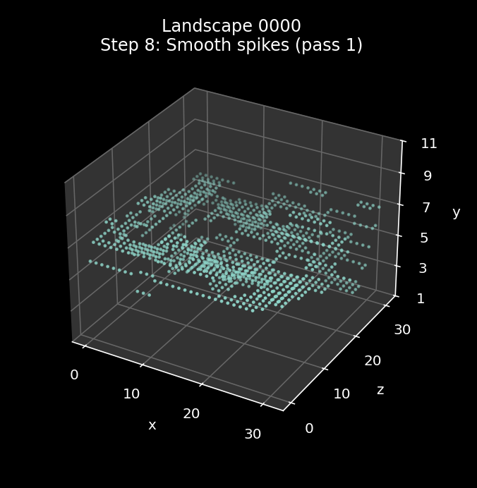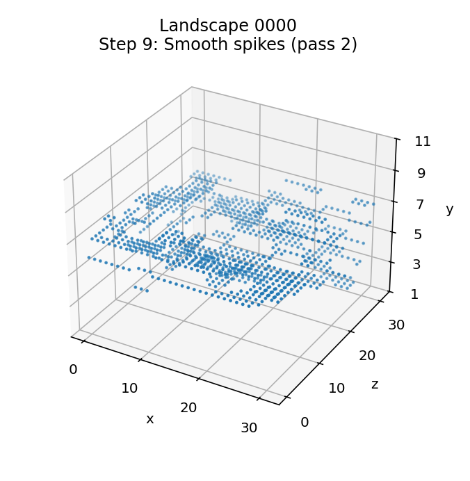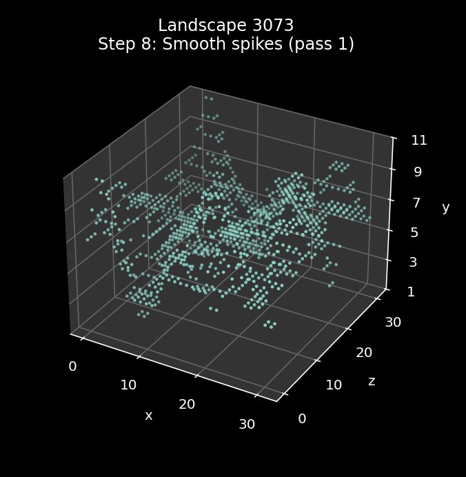 | 8 | Smooth any spikes and troughs (pass 1) | Smooth the landscape by smoothing over any single-point spikes or troughs | SmoothTileData A = bit 6 set |