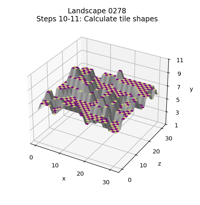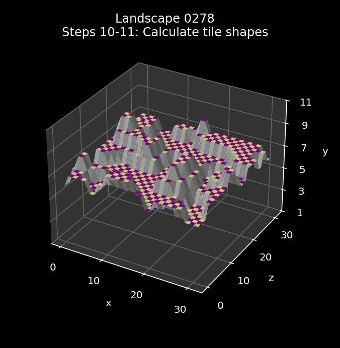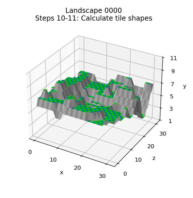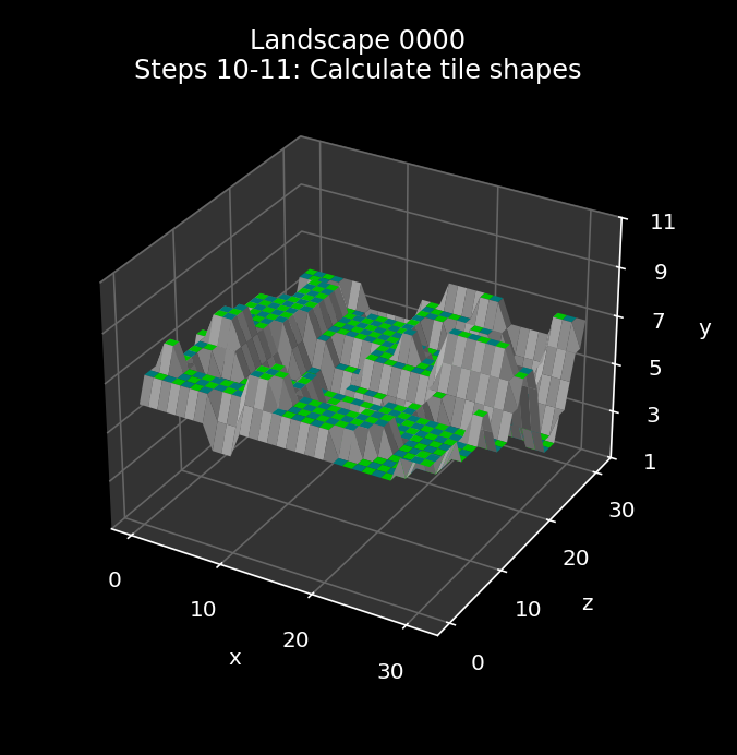 Here is the effect of the tile shape process when applied to landscape 0000, with the starting landscape from step 4 on the left and the tile-based landscape on the right: