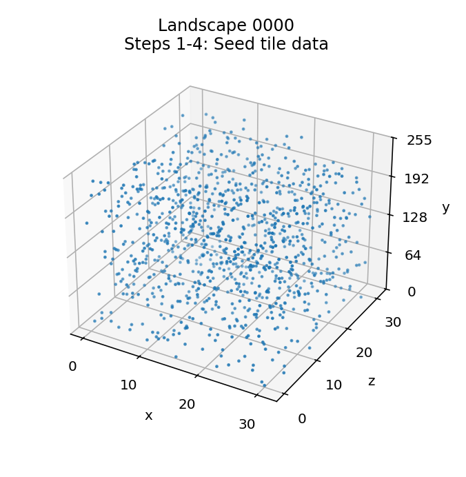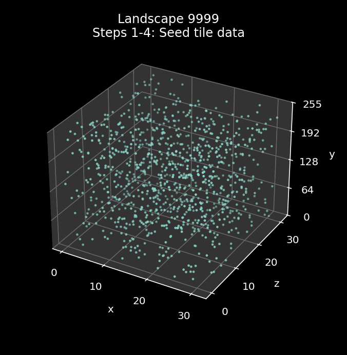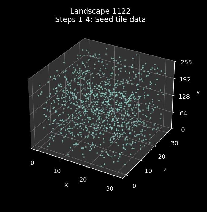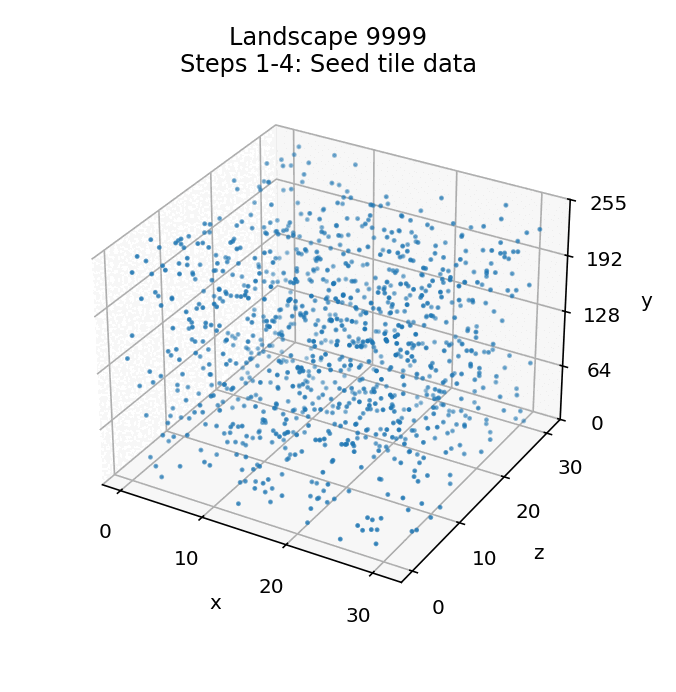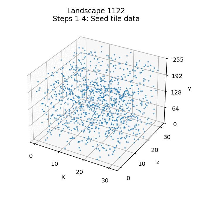 The x-axis is along the front left and the z-axis is along the front right, so the landscape grid is effectively the bottom level of this graph with the front of the landscape along the front left edge. Each tile has an associated seed byte in the range 0 to 255, which is shown by the height up the vertical y-axis.