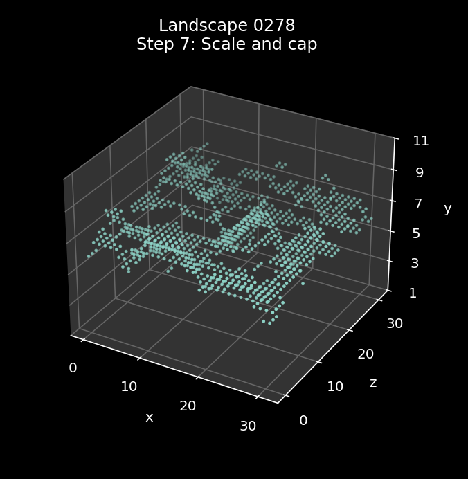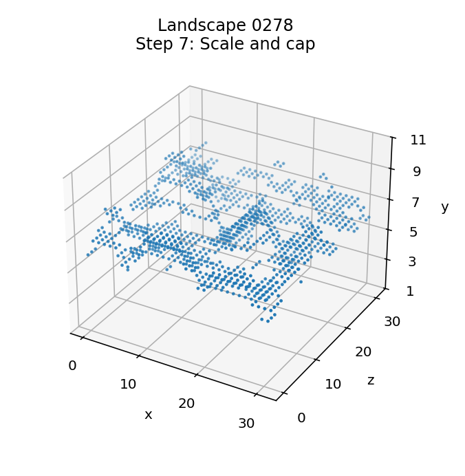 And here is the scaling process being applied to landscape 0278, where the small multiplier creates a gently undulating landscape with flat plateaus and hardly any peaks: