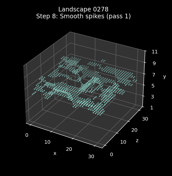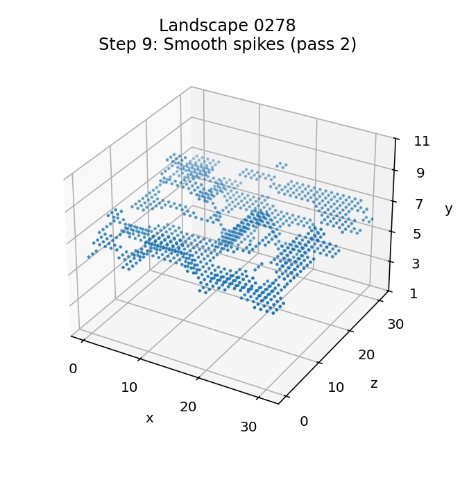 And here is the smoothing process being applied to landscape 0278, where the algorithm has quite an impact, smoothing those plateaus out nicely:
