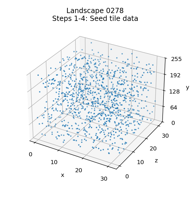 The seeds are random and all in the range 0 to 255. As an example, here are the initial tile seeds for landscape 0000: