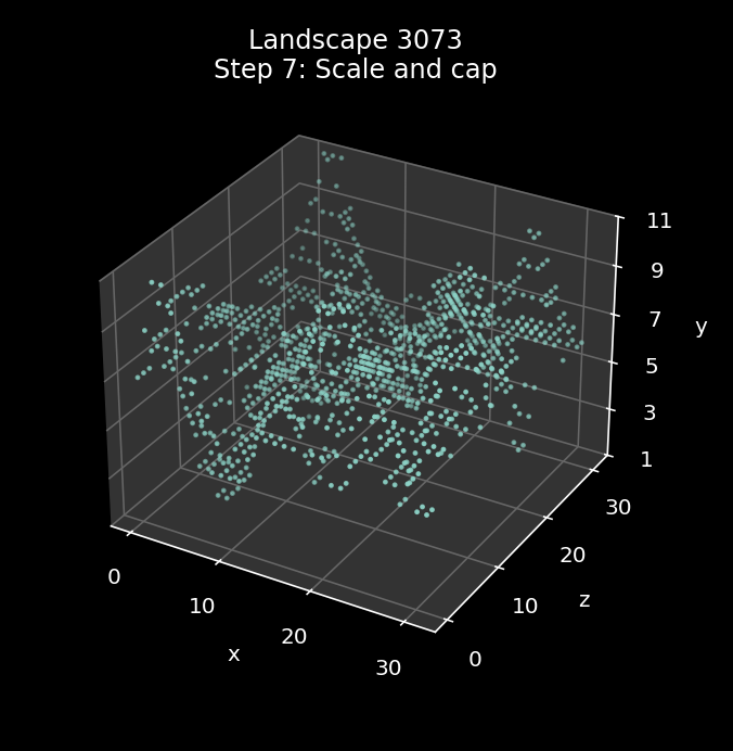 Our three example landscapes have wildly different multipliers, and this is the step where they start to diverge. Landscape 0000 has a middle-of-the-road multiplier of 24, while landscape 3073 is at the top of the range with a multiplier of 36, and landscape 0278 is at the bottom of the scale with a multiplier of 14.
