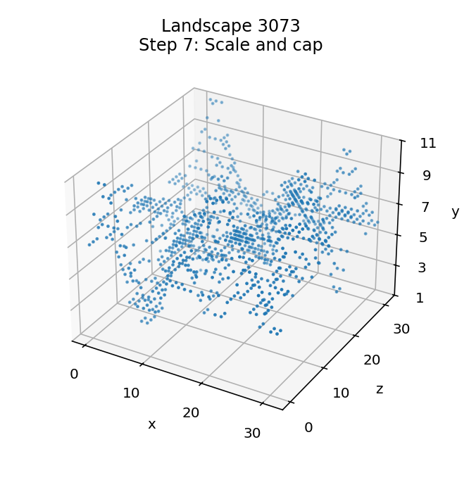 Here is the scaling process being applied to landscape 3073, where you can see the landscape being stretched into a tortured mass of sharp peaks and deep, dark valleys: