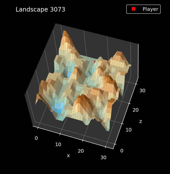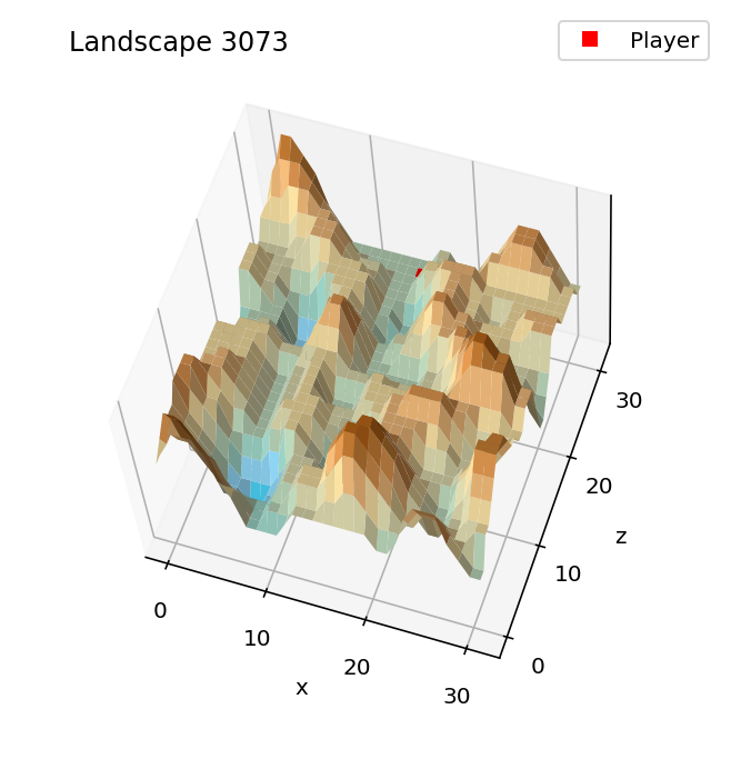 Here are the contour maps and heatmap for landscape 3073, where the player is at the back of the landscape and can only see tiles along the rear strip of landscape and in a vertical line towards the front row of tiles: