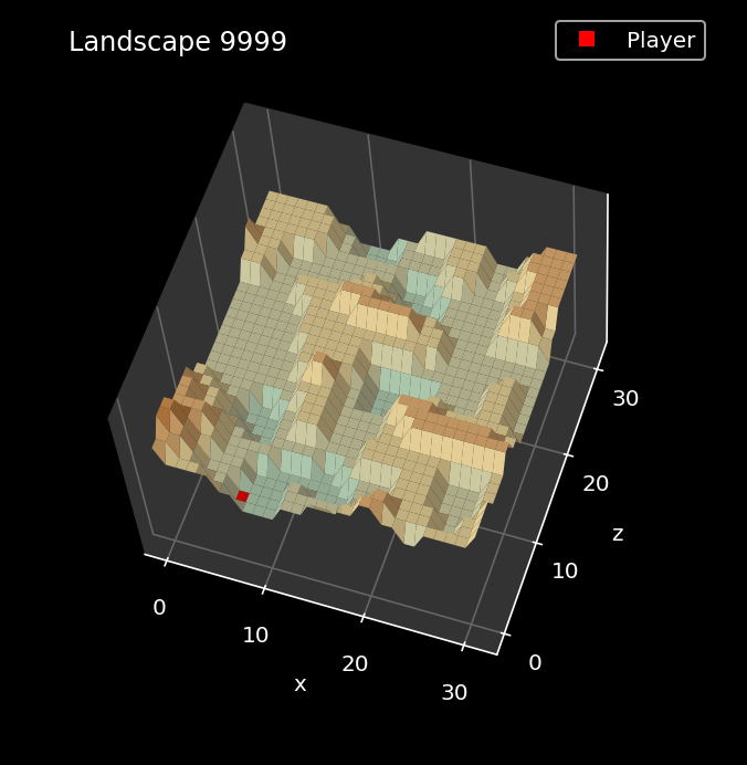 And finally, here are the contour maps and heatmap for landscape 9999, which has some interesting diagonal view lines from the player in the bottom-left corner of the landscape, all the way to the top-right:
